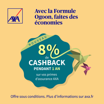 Ogoon : Formule du Compte bancaire AXAProfitez d'un cash-back sur vos primes d’assurance AXA, d'une Protection pour vos effets personnels et de bien d'autres avantages : Service de Reprise, Protection des Achats…